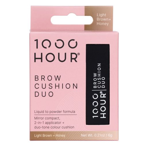 The 1000HOURĀ® Brow Cushion Duo is an all-in-one compact, featuring a waterproof liquid-to-powder formula plus mini 2-in-1 applicator brush/spoolie, and mirror.