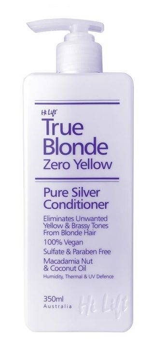 Hi Lift TrueBlonde Zero Yellow Pure Silver Conditioner eliminates unwanted yellow and brassy tones from blonde and grey hair.