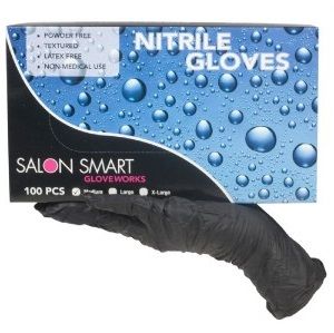 Salon Smart Gloveworks Black Nitrile Gloves offer superior puncture resistance. No more fears of tearing or ripping your gloves when you use Salon Smart Gloveworks Black Nitrile Gloves! Gloves are powder-free and textured, as well as latex-free and suitable for those with latex allergies. Perfect for non-medical, salon use.